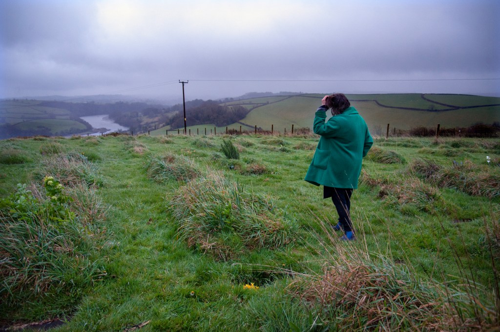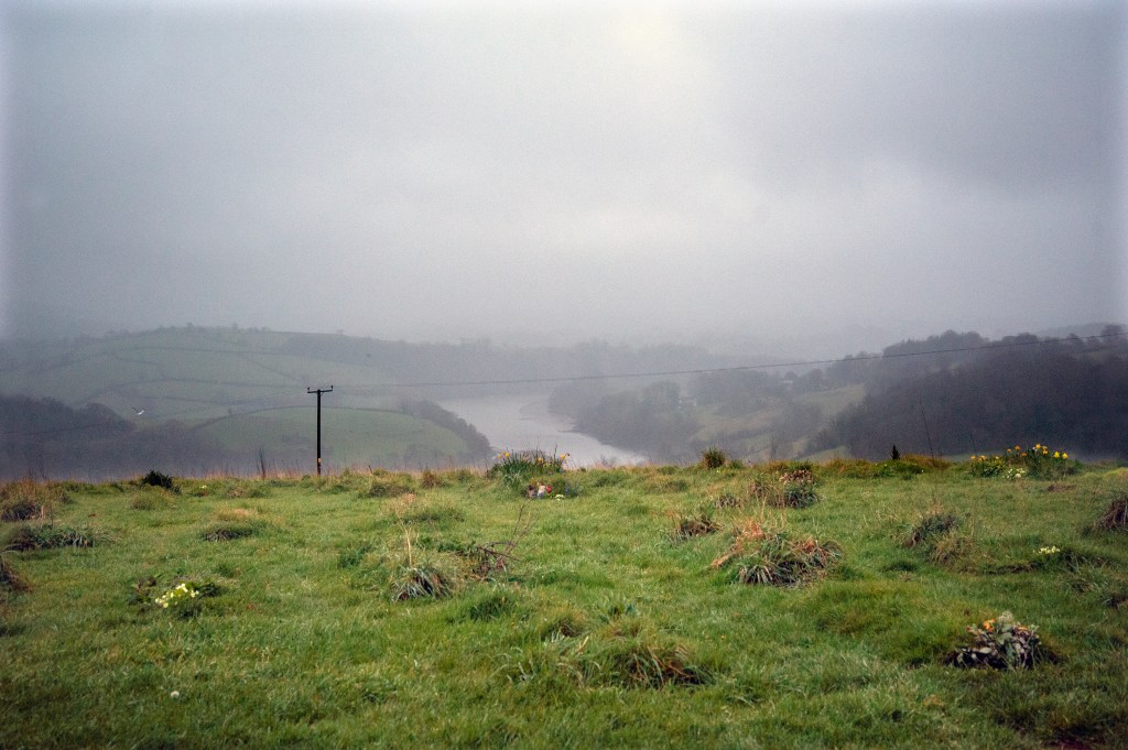 At the Green Hill the wind is howling across the car park and the rain is horizontal. Within minutes I am soaked. In the burial meadow, the wind is less strong. The sky is full of heavy grey clouds, and the river below is shrouded in mist.