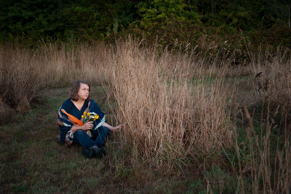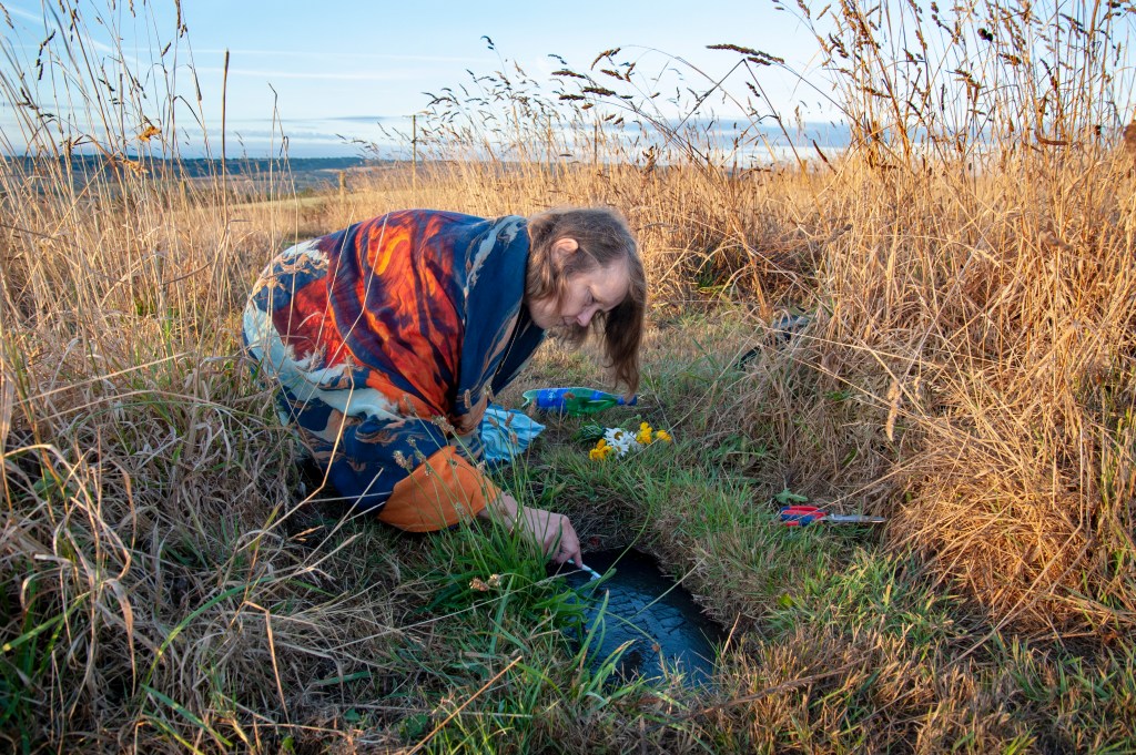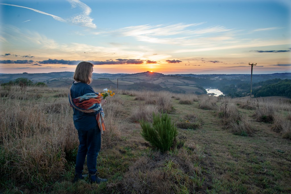We’re having a heatwave, most unusual for August. When I arrive at Sharpham the sky is a dusty orange, the river is full and shining below, and there are dark swathes of grey cloud over the horizon. The burial ground is many shades of pale brown, the grasses dry. I get there just in time to see the sun rise above the conical hill on the other side of the river. A bright orange glow bleeds from the sun, turning the light around it gold.