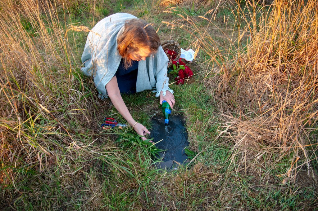 I stand, and then ceremonially scatter the rose petals over his grave. They flutter down between the grasses and settle on the ground like drops of blood. Blood of my heart, of my flesh, of my soul.