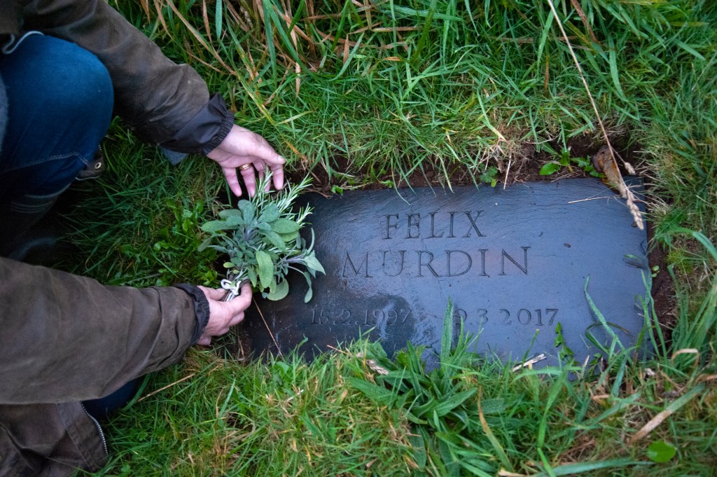 At this time of year there are no flowers in the garden, so I raid the herbs instead. I get my scissors and go and cut sprigs of rosemary and sage. Rosemary for remembrance. Sage for wisdom and immortality. I tie the small bunch of herbs with some string and hold it in my hand. I enjoy the act of picking the plants and making a bouquet. I am actively doing something to remember Felix, by taking him a gift.